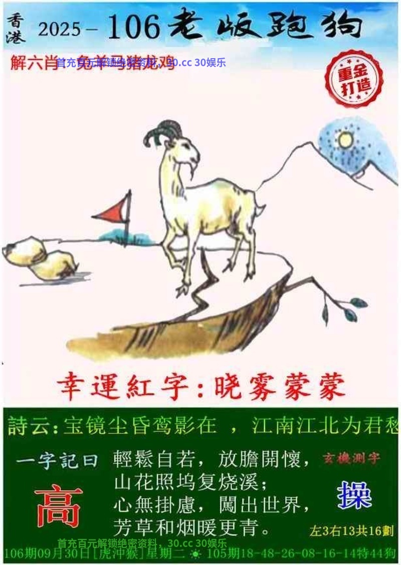 100期:今期狗猴虎看定,特碼旺大合单出开鼠30准 ①杀肖:羊鸡猪 ③大数+合单 |